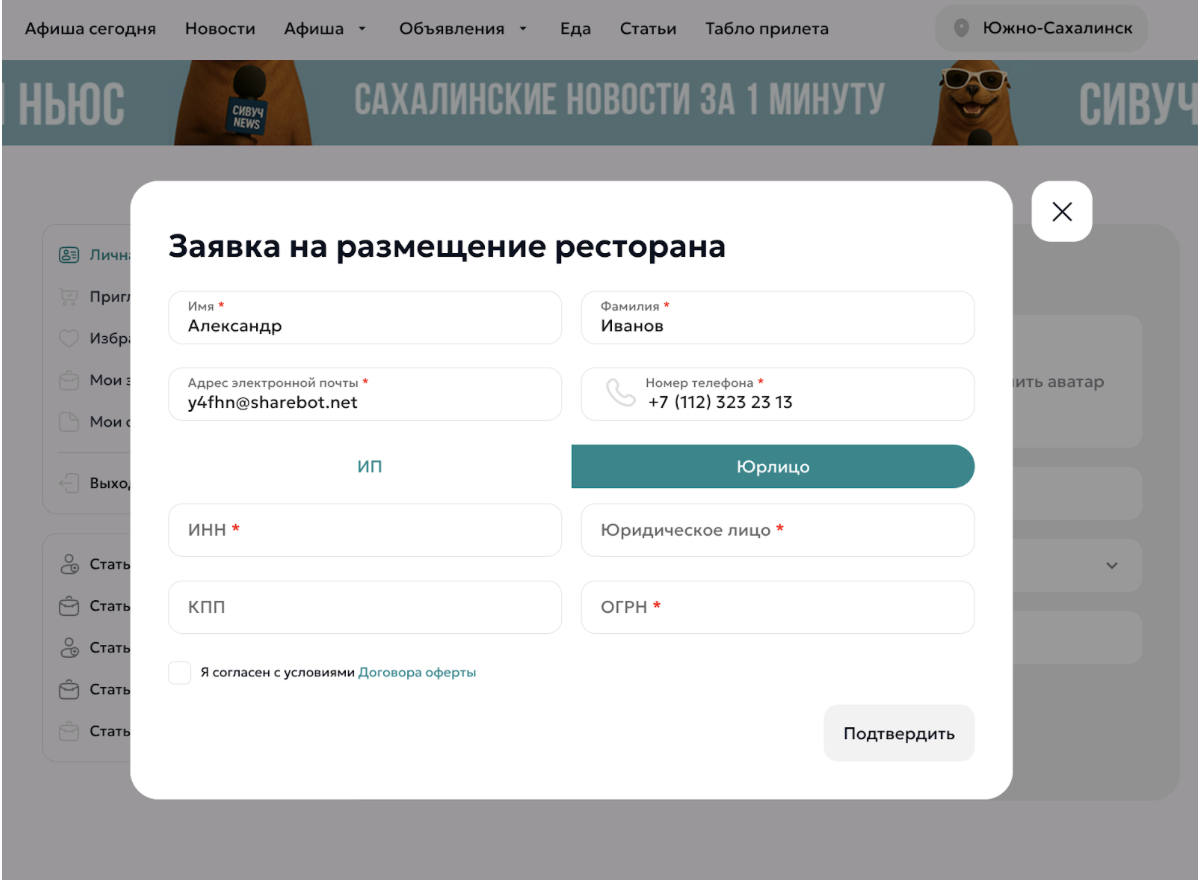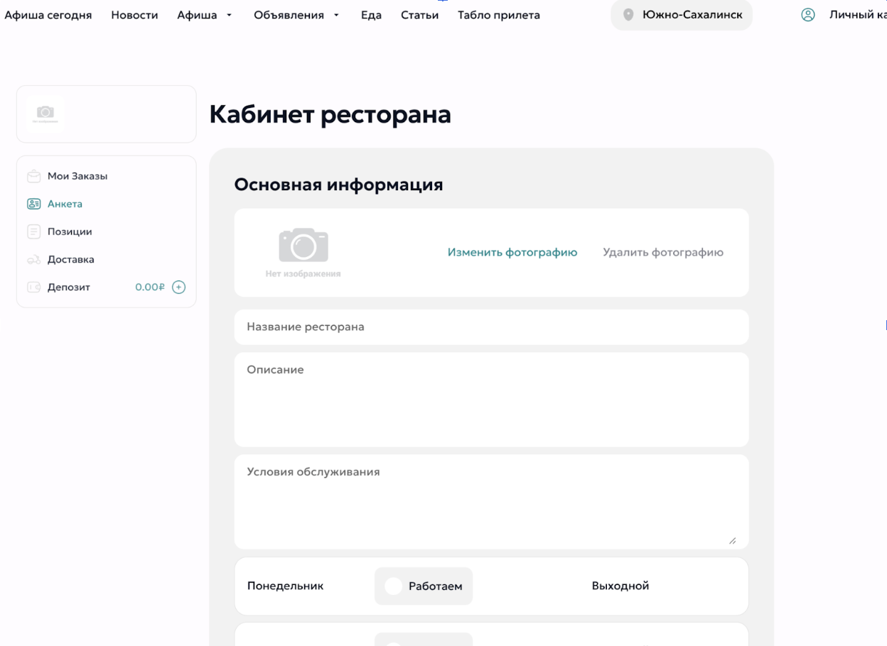 Шаг 4. Заполняем Анкету ресторана https://sakh.life/food-profile/personal