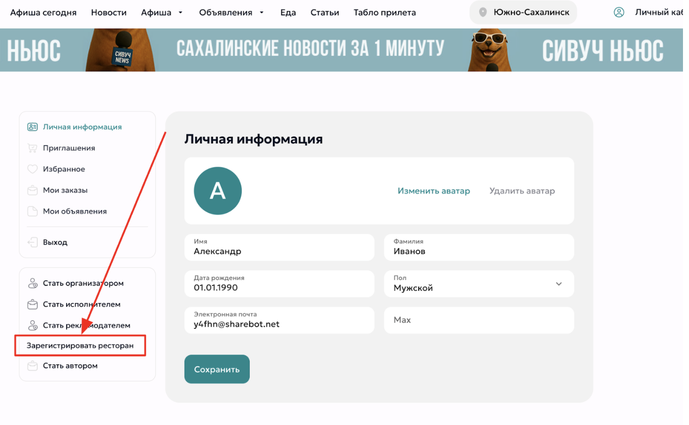 Шаг 2. В Личном Кабинете https://sakh.life/profile/personal нажимаем “Зарегистрировать ресторан”